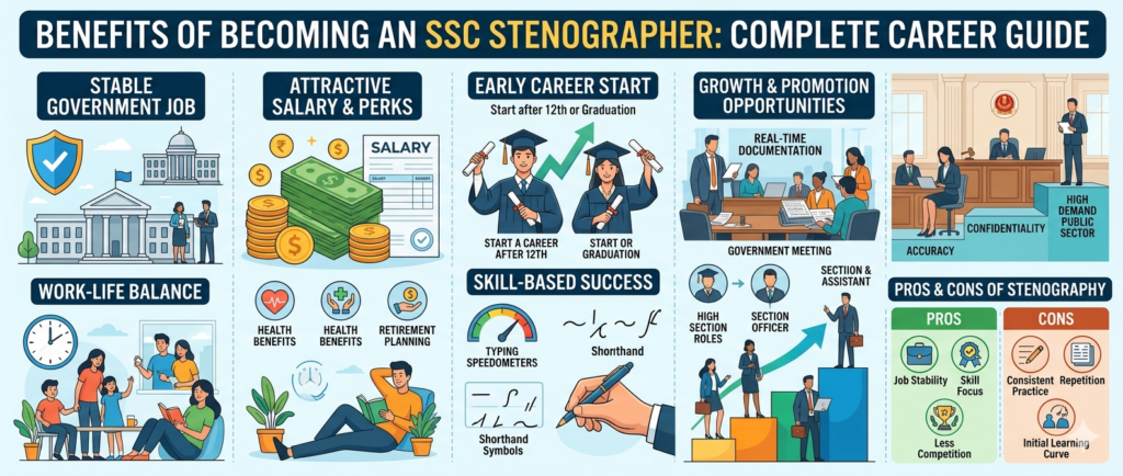 Choosing SSC Stenographer as a career comes with several advantages that make it highly appealing: